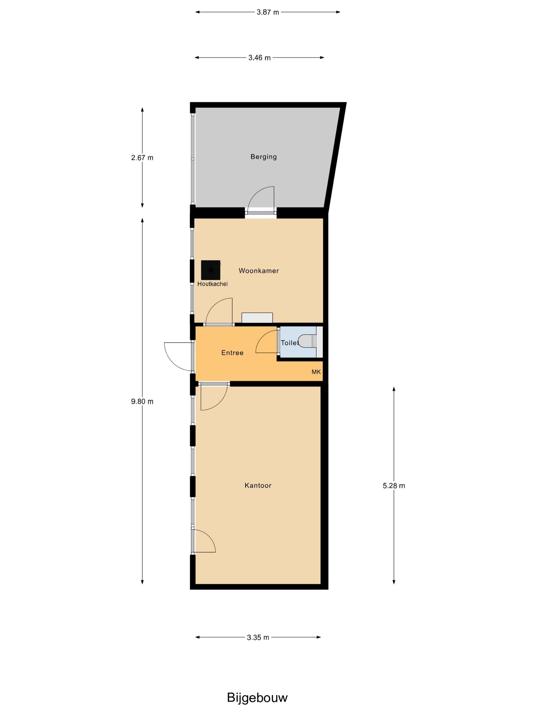 Het bijgebouw beschikt over meerdere ruimtes, waaronder een kantoor en verblijfsruimte. Dit maakt het object ideaal voor ondernemers, zoals zzp’ers, opslag, praktijkruimte of kleinschalige bedrijfsactiviteiten aan huis.